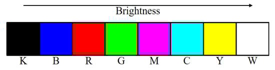 Shaked et al. [10] proposed a high-quality color error diffusion method based on the MBVC, i.e., to reduce halftone noise, select from within all halftone sets by which the desired color may be rendered, the one whose brightness variation is minimal [9,10]. Based on MBVC, they derived the minimal brightness variation quadruples (MBVQs): and , which are the subsets of S, the elements of which are ordered on the brightness axis as shown in Figure 5. Although Shaked et al. [9] suggested a different brightness order, and W, for a CRT screen, we would like to use the order in Figure 5 for consistency with Shaked’s algorithm. That is, selecting a suitable brightness order is a problem-dependent on the display environment of colors.