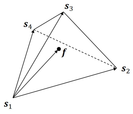For a given RGB color, we can determine the corresponding MBVQ uniquely by Shaked’s algorithm. Let be the MBVQ for a color . Then this situation can be illustrated as Figure 6, and we would like to express as a linear combination of as: