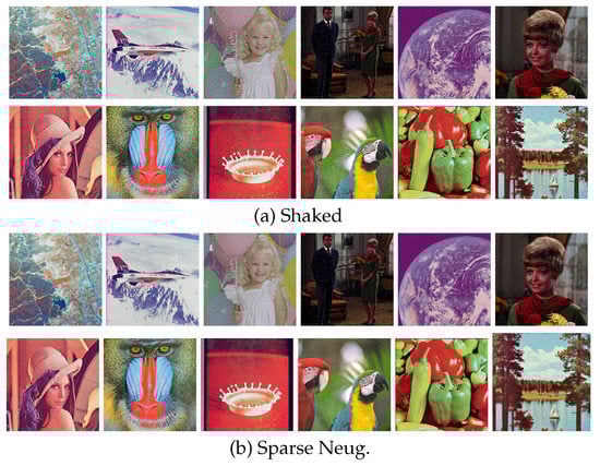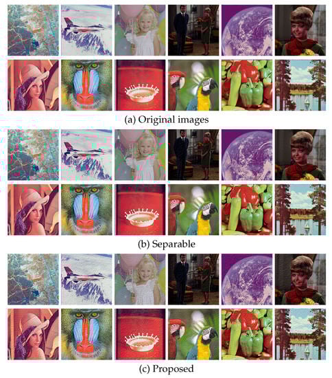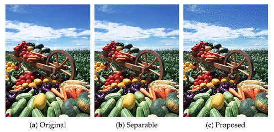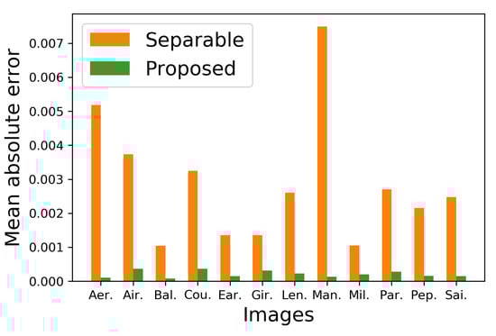 Figure 10 shows additional results on the standard image database SIDBA [18], which contains twelve color images as shown in Figure 10a. Figure 10b,c show the results of the separable and the proposed methods, respectively. Figure 11 shows the mean absolute error of the occurrence probabilities of the eight basic colors, where the vertical and horizontal axes denote the mean absolute error and the twelve images shown in Figure 10, respectively. The proposed method denoted by green bars achieved smaller errors compared with the separable method denoted by orange bars for all twelve SIDBA images.