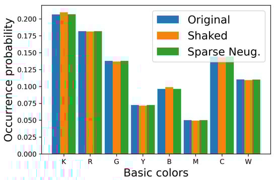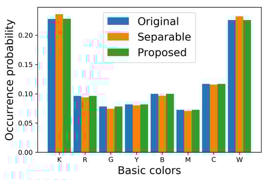 In order to show the difference between Figure 7b,c clearly, we show the occurrence probabilities of eight basic colors ( and ) in each image in Figure 8, where the vertical and horizontal axes denote the occurrence probability and the basic colors, respectively, where the occurrence probability of a basic color is defined by