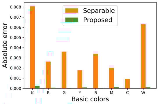 for , where and denote the occurrence probabilities of basic color in an original and its halftoned images, respectively. Figure 9 shows for eight basic colors, where orange and green bars denote that the occurrence probabilities are computed from the halftoned images by the separable and proposed methods, respectively. This figure shows that the proposed method can decrease the absolute error compared with the separable method.