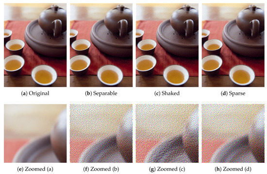 Next, we compare the proposed sparse Neugebauer model-based method (Algorithm 2) with Shaked’s method [10]. Figure 12 compares conventional separable, Shaked’s and the proposed sparse methods, where Figure 12a shows an original color image, which is halftoned by the separable, Shaked’s and proposed methods as Figure 12b–d, respectively. Their zoomed parts are also shown at the bottom of them.