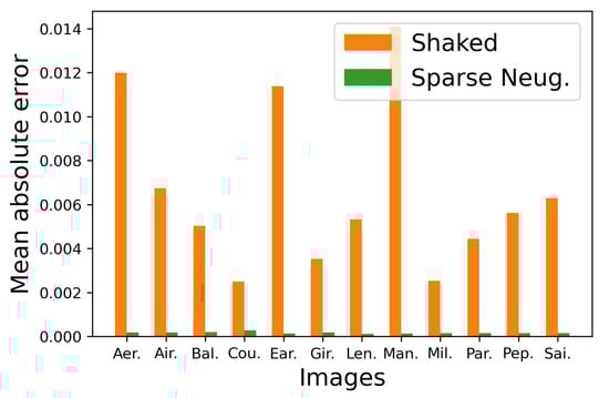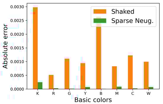 To confirm the difference between Shaked’s and the proposed sparse methods quantitatively, we show the mean absolute error of the occurrence probabilities of the eight basic colors in Figure 17, where the proposed sparse method denoted by green bars achieved smaller errors compared with the Shaked’s method denoted by orange bars for all twelve SIDBA images.