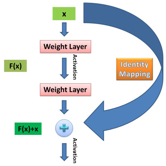 Residual learning framework with skip connections proposed in [55]. Instead of learning an unreferenced mapping (e.g., ), the network learns a residual mapping (e.g., , with ). In this simple case, shortcut connections perform identity mapping, and subsequently add their output to the convolutional layers’ stack outputs.