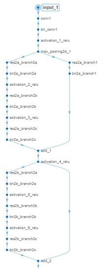 The pattern “family of operations” described in Figure 3 is repeated several times, one right after the other, in the whole network architecture in order to formulate the final model. Although the layers comprising the network architecture can be considered to be conventional (i.e., conv-convolutional, bn_conv-batch normalization, activation, max-pooling), it is of interest to note the flow-split in multiple branches operating on par and adding up their processing results to be propagated to the next “family of operations”. We selected the ResNet-50 model over a shallower network of the same family (e.g., ResNet-18) because the deeper the architecture, the lower the classification error obtained [55].