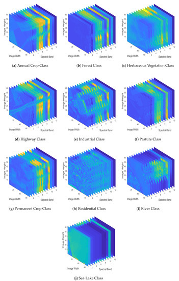Fortunately, quite recently, a large MS image dataset (containing RGB images as well) meeting the above requirements was released [60,61], where Sentinel 2A MS image data are employed to address land-use and land-cover classification tasks. The dataset comprises image patches measuring pixels, each one of them corresponding to spatial resolution of 10 meters/pixel, across 13 different spectral bands (in the 443 nm–2190 nm wavelength range). In total, several thousands of sample satellite images are gathered, across 34 different European countries (hence, the EUROSAT dataset name), ending up with 10 different classes.
