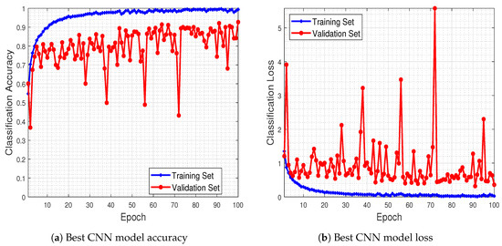 Regarding the optimization process followed during the training of the network, instead of the standard Stochastic Gradient Descent (SGD) optimizer, we employed Adagrad [56] with a learning rate of . The latter one was selected due to its adaptive selection of reducing the learning rate of parameters with high gradients and, conversely, increasing the learning rate of parameters which have small or infrequent updates. In order to recast the network’s outputs as probabilities, categorical cross-entropy was used as the loss function, as long as the cross-entropy can be interpreted as the log-likelihood function of the training samples.