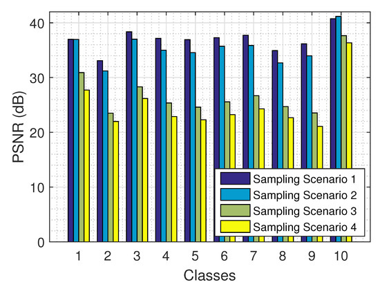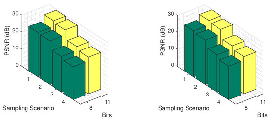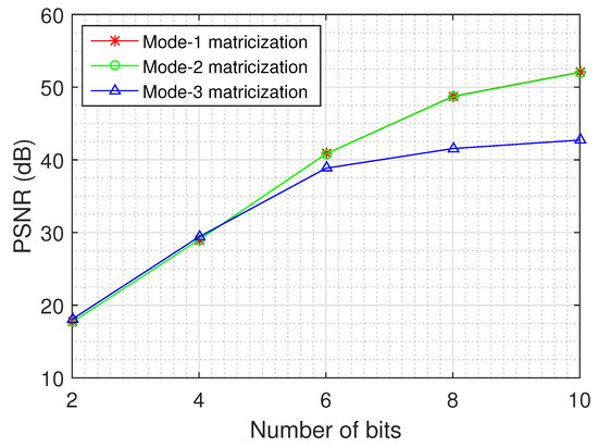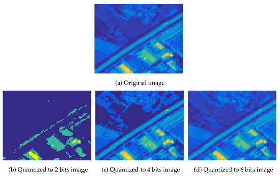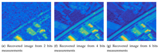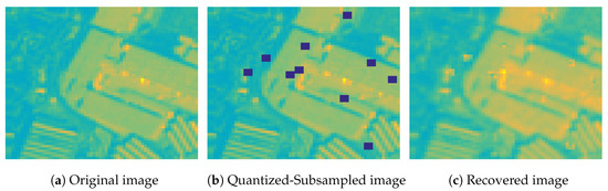 In a similar vein, the impact of compression on synthetic PROBA-V images was investigated in [48], where the authors considered two compression schemes—the TER and the CCSDS blue book standard which evolved to the CCSDS-122 standard for lossless and near-lossless MS and HS image compression—and investigated the impact on land-cover estimation. The authors’ conclusion is that compression has a minimal impact on classification, which is more pronounced in regions with multiple boundaries between different land-cover classes. Similar observations were drawn for the case of Landsat 7 Enhanced Thematic Mapper Plus (ETM+) observation compression using JPEG2000, SPIHT and CCSDS 122.0-B-1 and its impact on two important vegetation features, namely Normalized Difference Vegetation Index and Normalized Difference Water Index, which are reported in [49]. Nevertheless, the above methods cannot handle cases of missing observations, due to communication failures or physical obstacles like clouds, in contrast to our method that can efficiently recover the missing values for the subsequent processing using a quantized tensor completion algorithm.
