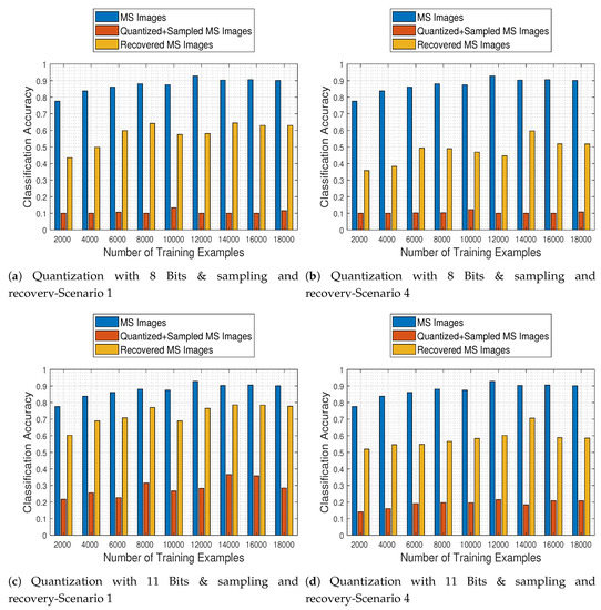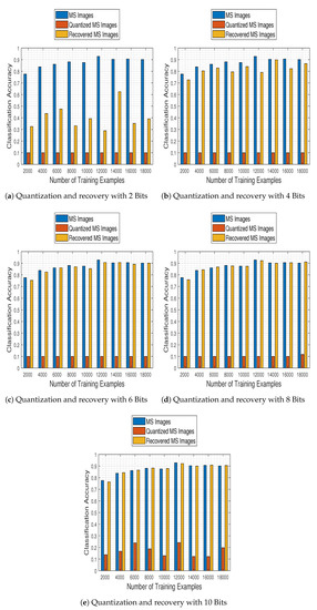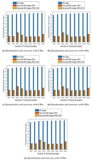 Furthermore, the quantification of the impact of compression on the classification accuracy of satellite images is explored in [47], where a framework based on the Multiple Kernel Learning algorithm is employed for the prediction of how compression affects the quality of extracted features for classification. Specifically, the authors consider the JPEG2000 compression standard and the subsequent classification of each image into five classes (water, forest, bare land, vegetation and residential area) by two classifiers, namely a maximum likelihood and a pixel-level SVM classifier. However, the prediction performance of their method is evaluated on images with only three bands (near-infrared, red and green bands), from GF2, Landsat 8 and ZY-3.