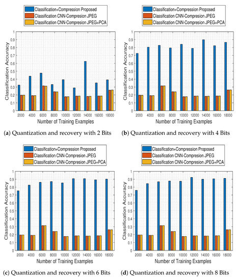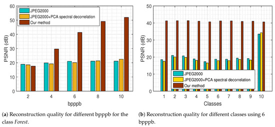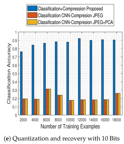 Finally, the impact of compression in the classification task of remote sensing images considered in the proposed scheme has also been examined with different compression and classification techniques. Specifically, the effects of JPEG2000 lossy image compression on the classification of WorldView-2 satellite images are explored in [45]. The authors consider the k-Nearest Neighbors (k-NN) and SVM classification methods, and experimentally demonstrate that even at high compression rates (30:1) there is a minimal impact on classification accuracy and in some cases, the results are even better than the original image classification. The same observation is established in [46] where the impact of lossy compression is investigated on Principal Component Analysis (PCA)-based spectral unmixing and SVM-based supervised classification using the CCSDS-ICS, TER and JPEG2000 compression schemes on AVIRIS data. However, these results indicate a strange behavior that cannot be completely trusted since very high compression ratios should have an adverse effect on classification accuracy.
