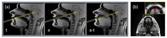 Figure 1. Illustration of the routine of the slice and region of interest positioning. (a) examples of frames of dynamic acquisition of the subject obtained with the real-time MRI sequence in the mid-sagittal plane: during production of /a/, of /t/ and transition between /a/ and /t/. The frame denotes the position of the slice touching the hard palate and perpendicular to the tongue motion direction; (b) example frame of the acquisition in the plane denoted by the frame in Figure 1a. Region of interest is shown by the rectangle. The inset presents zoomed-in region containing ROI.