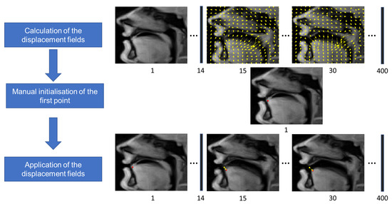 For motion registration, we used the method proposed in [43]. It consists in minimizing a cost function C ( u ) = S ( u ) + λ R ( u ) , where u is a displacement field, S ( u ) is a similarity function which was chosen to be the sum of squared pixel intensity differences, and R ( u x , u y ) = ( G x , G y , G t / v 0 ) u x 2 + ( G x , G y , G t / v 0 ) u y 2 is a regularization term imposing spatial and temporal smoothness on displacement field, where G x , G y , and G t are sparse matrices representing the gradients in the space and time directions and v 0 is a parameter allowing tuning of the relative weight given to smoothness in space and smoothness in time. The displacement fields are presented with vectors with length N = N x N y N t , and the gradients thus represent sparse matrices of size N × N . The resulting nonlinear least-squares optimization problem was solved using a multiresolution Gauss–Newton scheme. Tongue tip was selected manually by the user in the first frame, and propagated to the next frames using the displacement fields. The illustration of the tongue tip tracking procedure is shown in Figure 2.