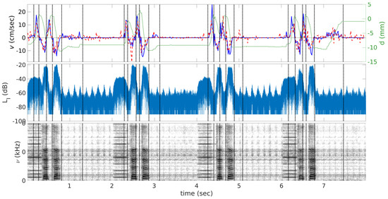 Figure 3. Velocity v (time) (the left scale) and displacement curves d (time) (the right scale) are shown on the top, sound level L I (time) (middle) and sound spectrogram s (time, ν ) (bottom) extracted from the real-time MRI images of the subject S2 and corresponding sound recordings. The solid curve corresponds to velocities evaluated manually, the dashed curve corresponds to those evaluated automatically, and the dotted curve corresponds to the displacement between the lower boundary of the slice used for the phase-contrast sequences and the tongue tip. Positive velocity values correspond to closure of the mouth and negative to opening. Vertical dash-pointed lines denote time when velocity takes zero value.