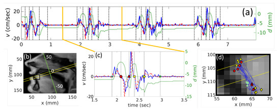 The development of computer vision algorithms opens the possibility of tracking the articulators automatically without tagging, using various methods, including optical flow [20,32], shape and appearance models [33,34], and deep learning methods, such as convolutional neural networks [34], and, more recently, conditional generative adversarial network for fully automatic segmentation [35]. Commonly, to estimate velocity, all these methods estimate a displacement by tracking tissues from one image to the next, and then calculate a time derivative. A mid-sagittal plane is used (with inter-frame time differences of the order of 20–50 ms), and, in most cases, require some labeling supervised by a human.