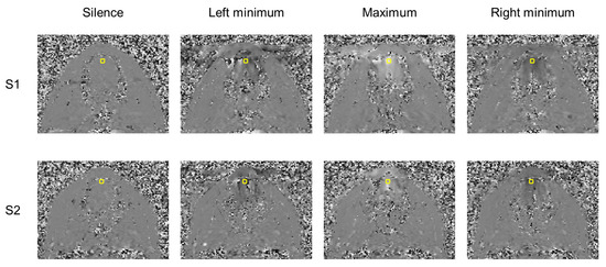 Figure 5. Examples of phase-contrast images acquired in the oblique plane for the initial position and the extreme tongue trajectory points which are presented in Table 1 for both subjects. Black color corresponds to π and motion downwards and white corresponds to π and upwards. The yellow rectangle denotes the region of interest.