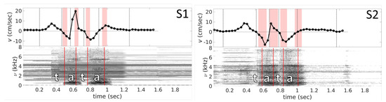 Figure 6. Velocity curves v (Time) and spectrograms s (Time, ν ) obtained from PC cine-MRI for subjects S1 and S2. Vertical dashed black lines on the velocity plots indicate time when velocity takes zero value, and denoted in correspondence with Figure 4. The filled zones indicate ( μ i σ i , μ i + σ i ) for onset and offset of the both vowels, where μ is corresponding mean, σ is the corresponding standard deviation, and i is index of the zone. The spectrograms are obtained from the sound averaged on the 21 repetitions aligned with the MR images. The vertical solid lines denote averaged onsets and offsets for both vowels.