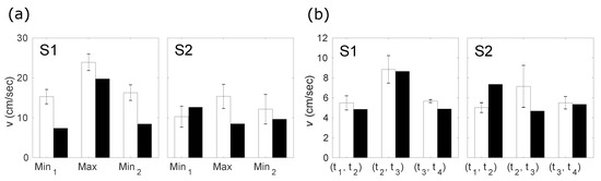 Figure 7. (a) peak velocity values evaluated with real-time MRI with manual labeling (white bars) and PC cine-MRI (black bars). Height of the bars represents mean absolute values of the first minimum, the maximum between two minima, and the second minimum. Error bars correspond to the standard deviation; (b) mean velocity values evaluated with real-time MRI with manual labeling (white bars) and PC cine-MRI (black bars). Height of the bars represents mean absolute values of the first opening having place within interval ( t 1 , t 2 ) , the closure between two openings (within ( t 2 , t 3 ) ), and the second closure (within ( t 3 , t 4 ) ). Error bars correspond to the standard deviation.