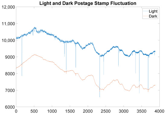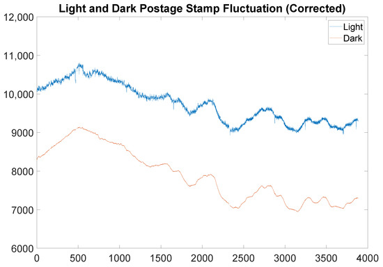 The above graph shows real light and dark postage stamp fluctuation over the time scale of a scan of the middle portion of the simulated munition after applying the filter prescribed in the Remark. For reference, the parameters used were a window length of 21, , , .