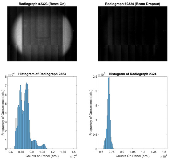 In fact, it is even clear from Figure 2 that there are images in which the beam is actually off throughout the entire 20 s image. An example of a reasonable image, juxtaposed against an image captured during beam dropout, is presented in Figure 3. It is worth noting that these are consecutive images captured approximately 20 s apart. Additionally, while it may be suspected that there is information that can be retrieved in an image in which beam dropout has occurred, the histograms presented in Figure 3 show that very little information is preserved when beam dropout occurs. Notice that while the range has been restricted to [6000, 15,000] for clarity in both the images presented and the histograms, there were very few responsive pixels in either image registering outside of this range during this scan.