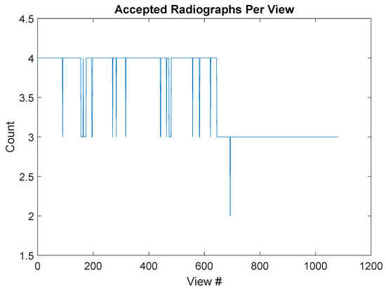 The next step is to collapse the dataset down to a total of 1080 views. To do this, it is first important to examine the data and determine whether a complete set of views exists in the accepted radiographs. The plot of accepted radiograph counts against view number is presented in Figure 5. In particular, this graph shows that each view is represented by a minimum of 2 radiographs, with a typical view represented by 3 or more radiographs. It is worth noting that this was not the case in other segments, but in those cases, each view was represented by at least one radiograph. Once we have established that all views are represented by at least one radiograph, we collapse the dataset down to 1080 projections by averaging over all available representations of the same projection. For instance, to form projection 0000, we would average all available views selected from .