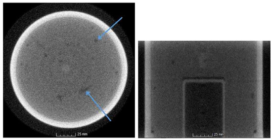 Left: No hard hits are observed in any slices in the corrected reconstruction. A sample slice is shown, with blue arrows indicating features examined via lineout (see Figure 8); Right: A side profile of the 3-dimensional reconstructed volume. Note that the intensity fluctuations (striping) in the side profile are no longer apparent. Visualizations created in Volume Graphics’ VGStudio Max (for information on VGStudio Max, see [22]).