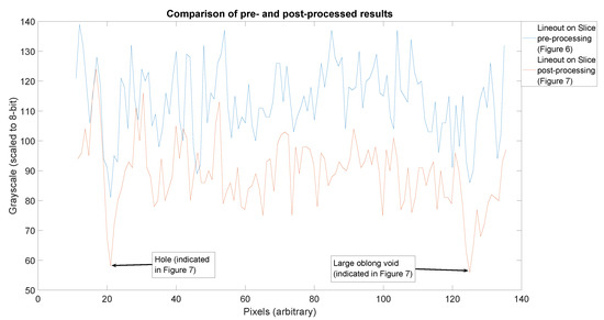 It is worth pausing for a moment to examine the quality of each of these slices and the relative value of this method. To illustrate this, we take a lineout through the two features indicated by blue arrows in Figure 7, extended in each direction by 10 additional pixels beyond the features of interest. The result is displayed in Figure 8. The grayscale values are slightly different due to the distinctions between processing steps applied. The curve in blue (representing the pre-processed data) is clearly the noisier of the two. Also notable is the degree to which the features of interest are clearly identifiable in the lineouts. These features are indicated by blue arrows. The first feature, a small hole near the outer extent of the slice, is obvious in both slice lineouts. However, when examining the inner void, the noise in the pre-processed slice (Figure 6) obscures the feature, while it is still quite clear in the post-processed slice (Figure 7). This is indicative of the degree of improvement observed in the reconstruction through the methods indicated in this work.