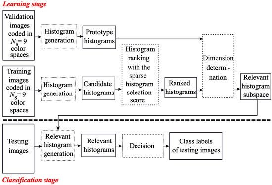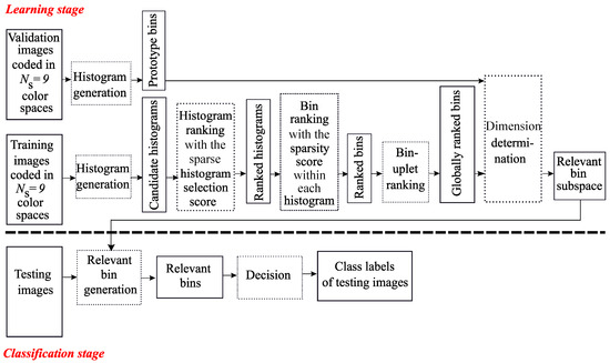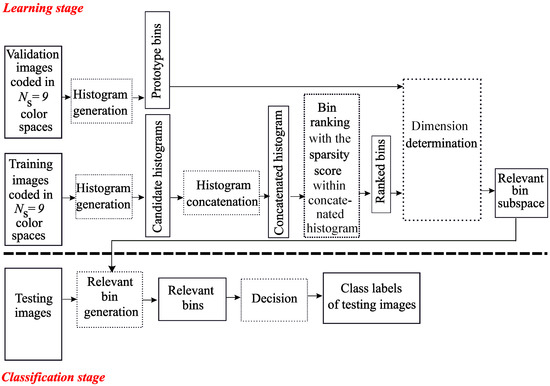 To find the relevant subspace, the selection procedure is carried out in the same way as in Section 3.4: the relevance of candidate bin subspaces with different dimensions are evaluated thanks to the classification accuracy. The selected subspace, whose dimension is , is the one which maximizes the rate of well-classified validation images (see Equation (2)). During the classification stage, the relevant bins previously selected are computed for each testing image to determine its class label.