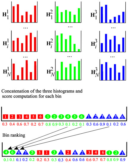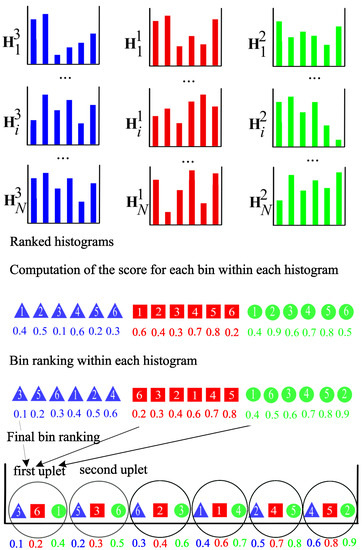 To illustrate the combination of histogram ranking and bin selection approaches, let us take the same example as in the previous section (see Figure 5). In this illustration, we assume that the histograms are ranked by a histogram selection score as , and . A bin ranking is then achieved within each histogram by the supervised sparsity score, whereas in the previous section, it is done within the concatenated histogram. The final bin ranking is a vector composed of the 6 triplet-bins. The first triplet is composed of the three first bins of , and , respectively. This procedure continues until the last triplet, which is composed of the three last bins of , and respectively, is constituted.