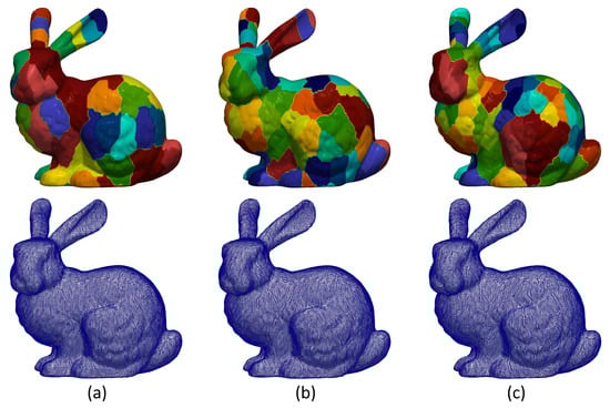 (First line) Segmentation of bunny model using MeTis algorithm in (a) 70, (b) 100 and (c) 200 parts. (Second line) The corresponding reconstructed models without applying overlapping process (edge effect is apparent).