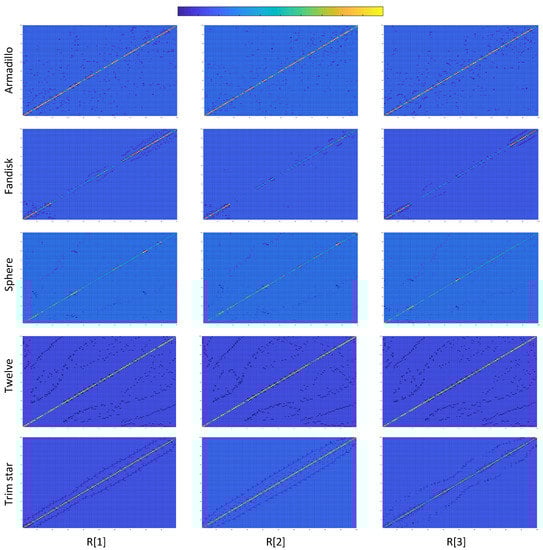 Figure 6 presents colored images representing the Laplacian matrices of different submeshes for several 3D models. Providing an easier comparison between the images, we have created matrices of submeshes with the same size so that . Each pixel of an image represents the corresponding color coded value of . Additionally, a color bar is also provided showing the range of colors between the lowest and the highest value of each matrix , where, the deep blue represents the lowest value of each matrix while the bright yellow represents the highest value. We can observe that different submeshes of the same model follow a similar form while they are totally different in comparison with submeshes of different meshes.