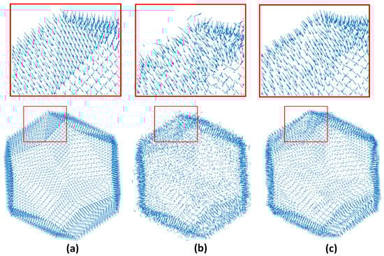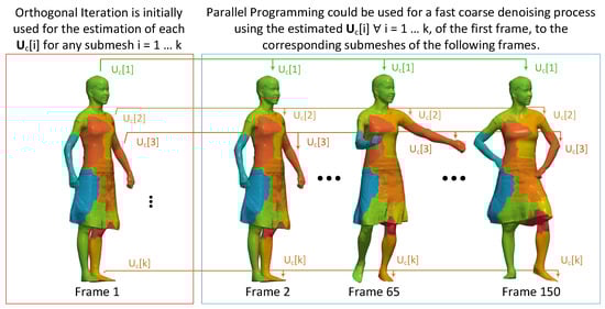 In the literature, a lot of works have been presented related to compression of 3D meshes and point clouds [38,39,40]. The spectral compression methods utilize the subspace of the eigenvector matrix for encoding the geometry of a 3D mesh. This matrix can be computed by a direct SVD implementation or by executing a number of orthogonal iterations on , and it is used as the encoding dictionary to provide a compact representation of the vertices of each submesh.