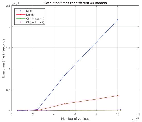 Figure 11 depicts plots that show the execution times of two OI approaches (i.e., OI (t = 1, z = 1) and OI (t = 1, z = 4)) in comparison with the execution times of the Manifold Harmonics basis (MHB) and Limited-memory MH Filtering (LM-filt), as presented in [17]. The main reason why our method is much faster than other decomposition methods is due to the fact that it handles many but much smaller matrices (of submeshes) than the large Laplacian matrix of the initial whole mesh. The execution time to decompose a matrix exponentially increases as the dimension of the matrix also increases. On the other hand, the cumulative time to decompose many but small matrices is significantly lower.
