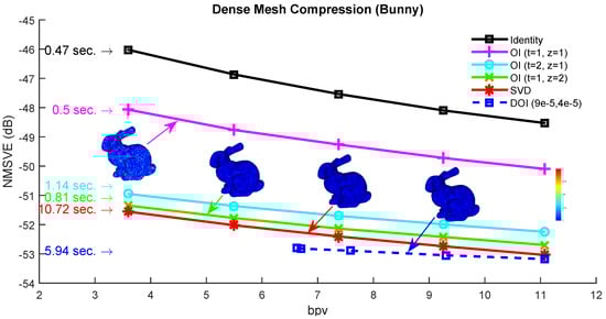 The spectral compression approach is performed as described in Section 6.1. Figure 12 shows how the selected rate of bit per vertex (bpv) affects the metric NMSVE for different compared approaches. We also provide the execution times, next to each line, that encapsulates the respective time needed to run each method (e.g., to construct the matrix and execute the OI).