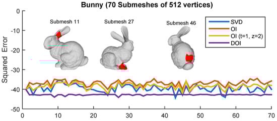 For the case of DOI, there is an increase in the execution time, in comparison to OI. However, it still is significantly faster than the SVD (it needs almost half time). On the other hand, there is a significant increase in the final compression rate (bpv), which is captured as a right shifting of the plot in Figure 12. The shifting is more obvious when the initial value of c is small which means that more iterations are necessary for achieving the satisfying accuracy. The theoretical complexity of the proposed schemes is in tandem with the measured time. More specifically, the OI approach for the “Bunny” model can be executed much faster than the direct SVD approach. While running more OI iterations yields a better NMSVE, converging towards the (optimal) SVD result, it comes at the cost of a linear increase in the decoding time. On the other hand, one iteration of achieves the same visual error as executing four OI, in considerably less time. Figure 13 plots the squared error per each submesh of the Bunny model (70 submeshes in total). Each presented approach has a different reconstruction performance in different submeshes except of the DOI that provides a stable reconstruction accuracy due to the “ideal” value of subspace size that is required to satisfy a predefined reconstruction quality threshold. Figure 14 presents the heatmap visualization of the normals’ difference between the ground truth and the reconstructed models for different OI approaches and SVD.