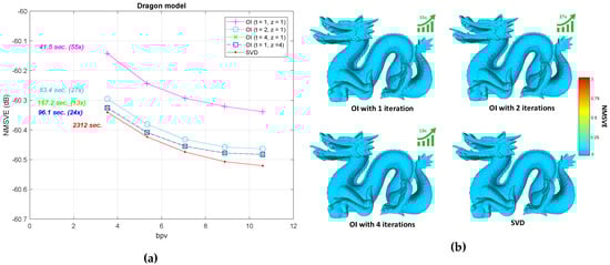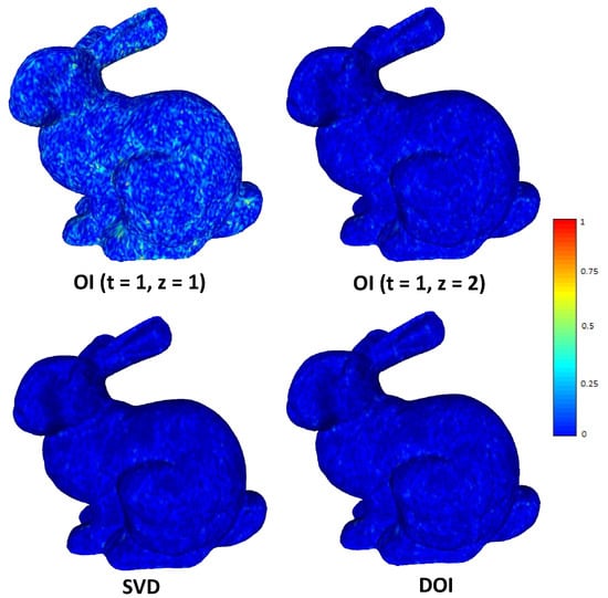 The plot of bpv vs. NMSVE for the “Dragon” model is shown in Figure 15a. Note that the execution times shown next to each line encapsulate the respective time needed to construct , and to run the respective number of OI, with the speed-up as compared to SVD shown in parenthesis. By inspecting the figure, it can be easily concluded that the quality of the OI method performs almost the same as with SVD, especially when the number of iterations increases. Additionally, in Figure 15b, we provide the heatmap visualization of the normals difference between the ground truth and the reconstructed models for different OI approaches and SVD.