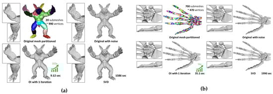 For the spectral denoising approach, we followed the same steps as these that are described in Section 6.2. OI was used as a pre-processing “smoothing” step before applying the fine spectral bilateral filtering. In Figure 16, we present the smoothed results (“Armadillo” and “Hand” models) between the OI approach and SVD. As we can see, the results of the two methods seem identical. The direct correlation between the size of a block and the execution time speed-up as compared to direct SVD is also highlighted here. For this scenario, zero-mean Gaussian noise was added to the models. The “Armadillo” model was partitioned into 20 submeshes each comprising around 990 vertices, while the “Hand” model was partitioned into 700 submeshes with 470 vertices per block.