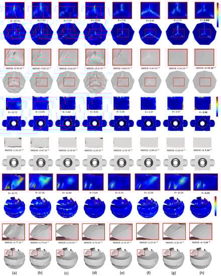 In Figure 17, we present reconstructed results of different models (i.e., twelve, blocks, sharp sphere) using a variety of state-of-the-art methods. For an easier comparison among the methods, we also provide enlarge details as well as the NMSVE and mean metrics. Heatmap visualizations are also offered to show the distortion alleviation. The visualized results show that our approach outperforms all the other compared methods.