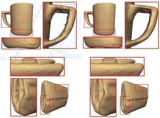 We also present the denoising results of two real-scanned noisy 3D models (i.e., cup and wallet in Figure 18). Our method removes the abnormalities without over smoothing the surface of the object, preserving at the same time the high-frequency features of the objects. However, the evaluation of our method, in this case, is not feasible since the ground truth model is not known beforehand. An extended experimental analysis and results can be found in the Supplementary Materials (File S1).