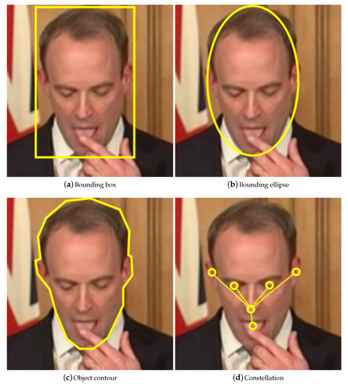 - Object representationThe shape, appearance, and location of the target are encoded in the target state. The state should balance accuracy with invariance: an accurate model will ignore clutter, reducing false-positives; an invariant model will allow for variable perspectives or illumination levels, reducing false-negatives.The shape is usually modelled as a centroid (e.g., a radar response), bounding rectangle (e.g., an approximation of the outline of a vehicle), bounding ellipse (e.g., the outline of a ping pong ball), chain of points/contour (e.g., the outline of a person), or constellation (e.g., the eyes, eyebrows, nose, mouth, and ears of a face) [20].If the model’s shape does not exactly fit a given object, then parts of the background will be included, or parts of the object will be excluded. If the model is fixed to a precise shape then it will be inflexible: if the tracked object changes shape, or the video changes perspective, then the model will no longer be representative.