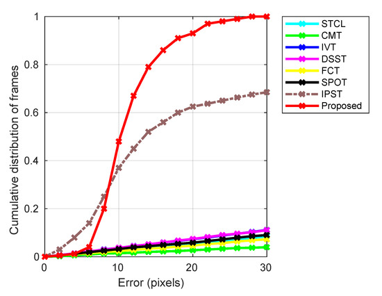 The key results are summarized in Figure 4. The plot characterizes the empirical performance (taken as reported in the literature) on the BBC Pose data set of eight different methods (see the legend above the plot), namely the Spatio-Temporal Context Learning (STCL) tracker [42], the Structure-Preserving Object Tracker (SPOT) [24], the Incremental Visual Tracker (IVT) [38], the Fast Compressive Tracker (FCT) [43], the Discriminative Fast Scale Search (DSST) tracker [44], the Clustering Model Tracker (CMT) [25], and the Incremental Pictorial Structure Tracker (IPST) [39] as well as the proposed method (our experiments). Table 2 lists the values of our algorithm’s parameters. These were chosen as sensible values based on our understanding of the application domain. In practice, in cases when no similar information is available, the parameter values can be learned using the standard training-validation-test protocol.