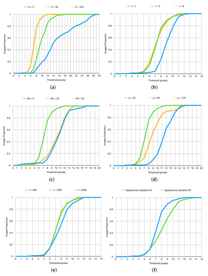 As expected, increasing the value of the parameter m produced more accurate tracking results, as demonstrated by the plot in Figure 5a. Recall that m determines the dimensionality of the subspace used to capture each part’s appearance [37]. Consequently, our finding can be seen to make intuitively sense: a higher value of m leads to a more complex and expressive model appearance model, with less information being discarded. This of course comes at a cost. Increasing m increases the size of matrices and , thereby imposing greater storage requirements and increasing the time needed to calculate . Thus, in practice, a balancing act needs performed, with the exact trade-off being highly dependent on the nature of the objects being tracked as well as the environmental context. For example, in Figure 5a, the usual phenomenon of diminishing returns is clear, the change from to effecting greater performance differential than from to .