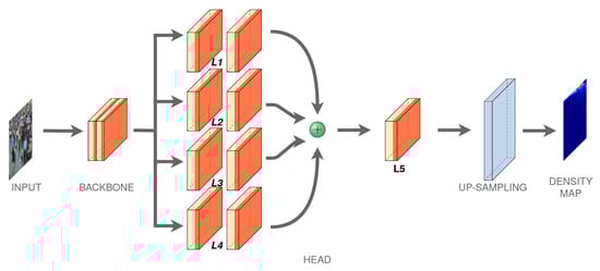 We estimate this density map by designing a convolutional neural network composed of: (i) a backbone for features extraction and (ii) a multi-head layers that combining these features obtaining a density map which contains an estimation of people number of the input crowd images. A scheme of the proposed architecture is showed in Figure 1.