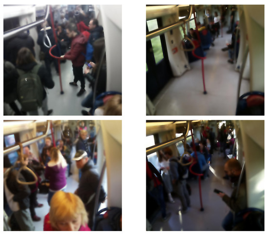 The dataset proposed in this work contains images acquired from metropolitan wagons in Naples (Italy). The dataset is composed of a total of 2823 images of the same resolution ( pixel), 1886 of which are train images, 474 validation images and 463 test images, involving 16,070 people. The dataset is unbalanced, in particular, cases where the wagon is full are less than in a partially full car situation. There are also images where the wagon is empty, this represents a real challenge for the neural networks, as they are not designed to analyze empty spaces. Sample images of this dataset are shown in Figure 5.