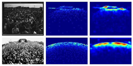 For each image is annotated the number of people involved and the position of the head of each of them = {, , …, }. For the public datasets these positions are already provided, for the private dataset it was necessary to annotate them using the YOLOv3 neural network. Ground-truth density map from it is generated as proposed in Reference [23]. A head to the pixel, it is represented as a delta function (x − ). An image with heads labeled can be represented as a function:
