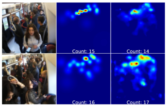 We demonstrate the proposed architecture in three sub-experiments the first on three public available datasets, UCF_CC_50 [12], ShanghaiTech part_A, ShanghaiTech part_B [14] changing different backbones, the second on the same datasets against the previous state of the art method, the third evaluating our approach on the novel subway cars dataset. The MH-MetroNet network architecture used for the training phase is that described in Section 3. In particular, different well-known backbones have been used—ResNet-152 [32], DenseNet-121 [31], SeNet-154 [33], EfficientNet-b5 [34].
