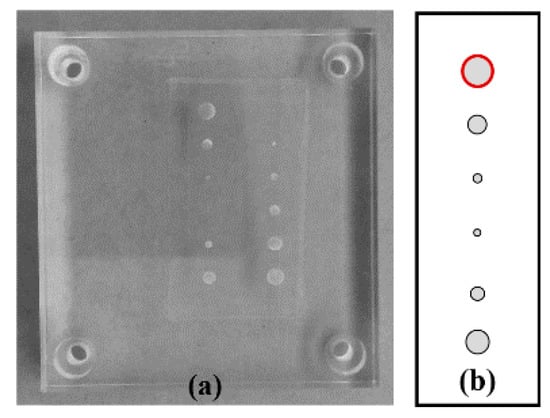 (a) Acrylic phantom simulating breast tissue and high density lesions (aluminum disks of different diameters and 1 mm thickness). (b) Scheme of the disks in the first column (top to bottom): 5.0 mm, 3.0 mm, 1.0 mm, 0.5 mm, 2.0 mm, and 4.0 mm, respectively.