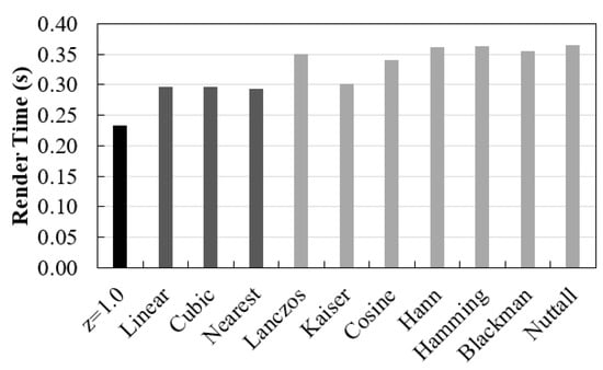 Computation time required for rendering the original data (z: 1.0 mm) and data after rescaling with linear, cubic, nearest interpolators and Lanczos, Kaiser, Cosine, Hann, Hamming, Blackman, and Nuttal window functions (with sampling distance 1.0 mm).