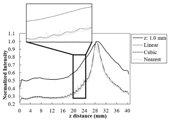The 5.0 mm disk’s profiles were obtained from the rendered images with each sampling distance value and for each interpolator. The measured profiles between 20 mm and 36 mm (z distance) are shown in Figure 10.