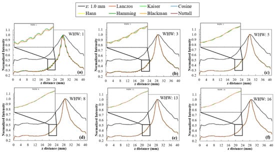 The sinc function was multiplied by different window functions (Lanczos, Kaiser, Cosine, Hann, Hamming, Blackman, and Nuttall). The 5.0 mm disk’s profiles obtained with WHW values ranging from 1 to 16 are presented in Figure 5.