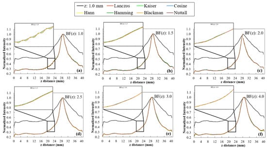 The profiles calculated with BF (z) values ranging from 1.0 to 4.0 are shown in Figure 7 from (a) to (f), respectively. As for the WHW, based on profiles of Figure 7, the corresponding smoothness and FWHM values for each BF (z) and window function were determined and the results are presented in Figure 8.